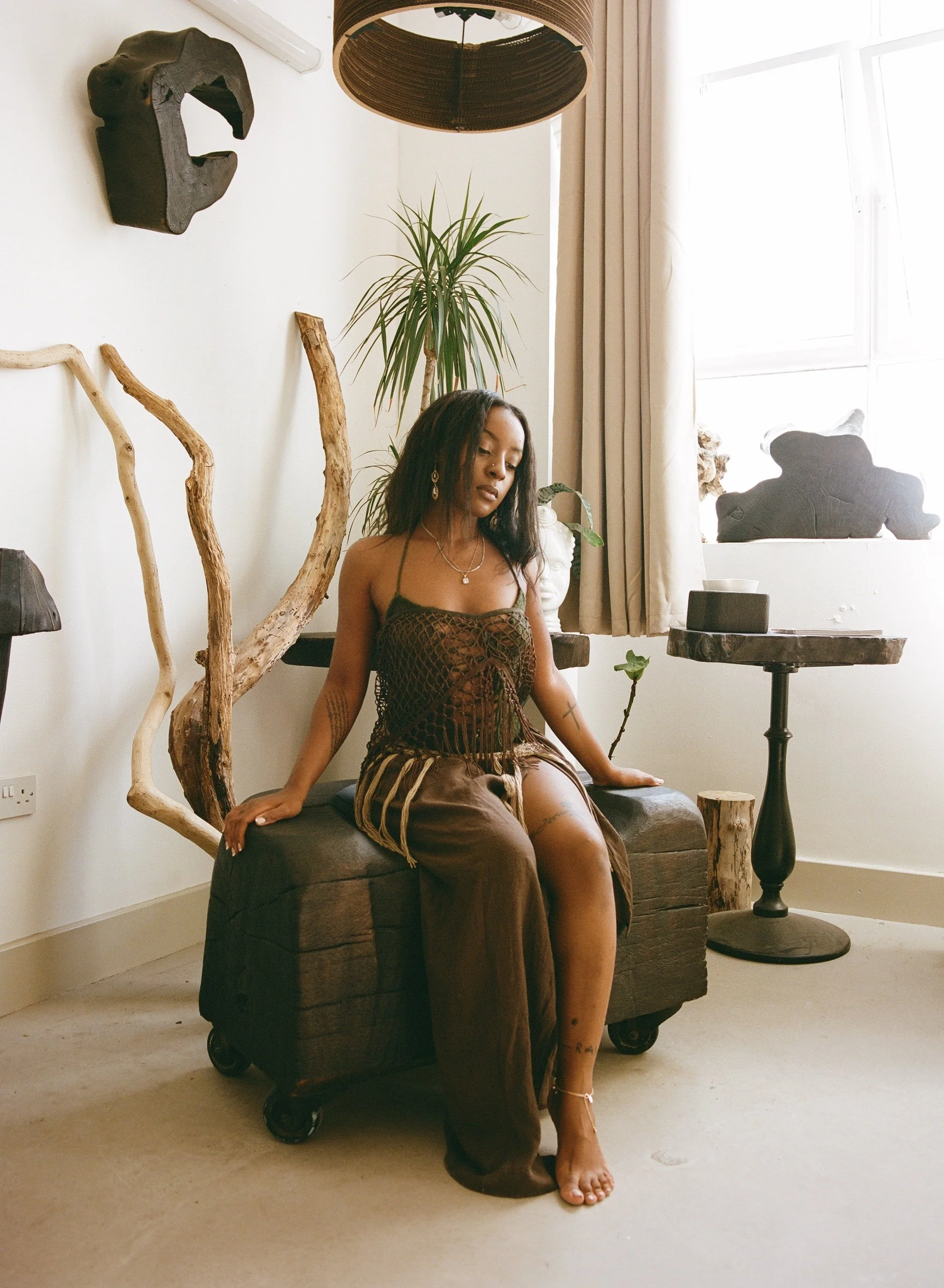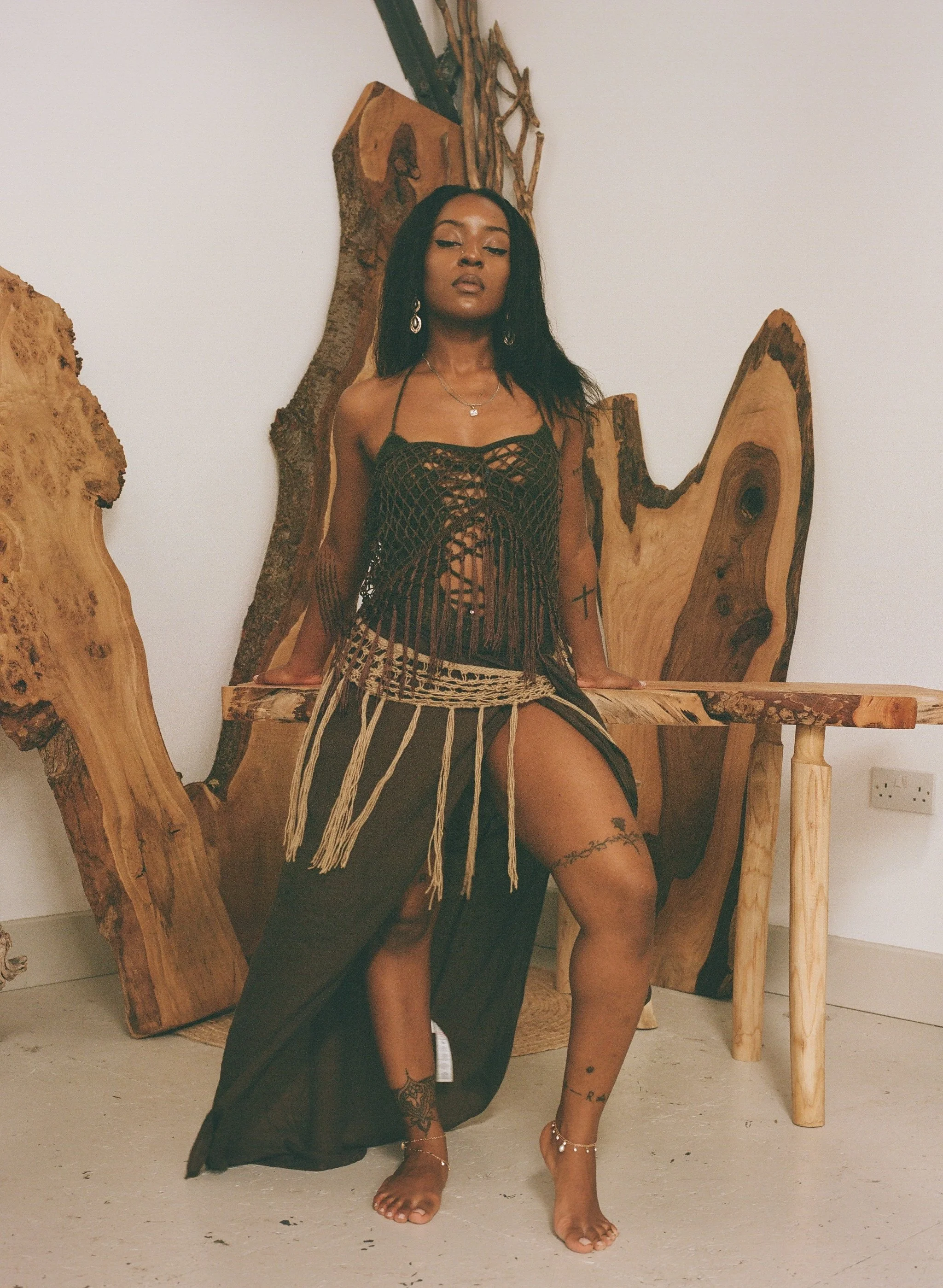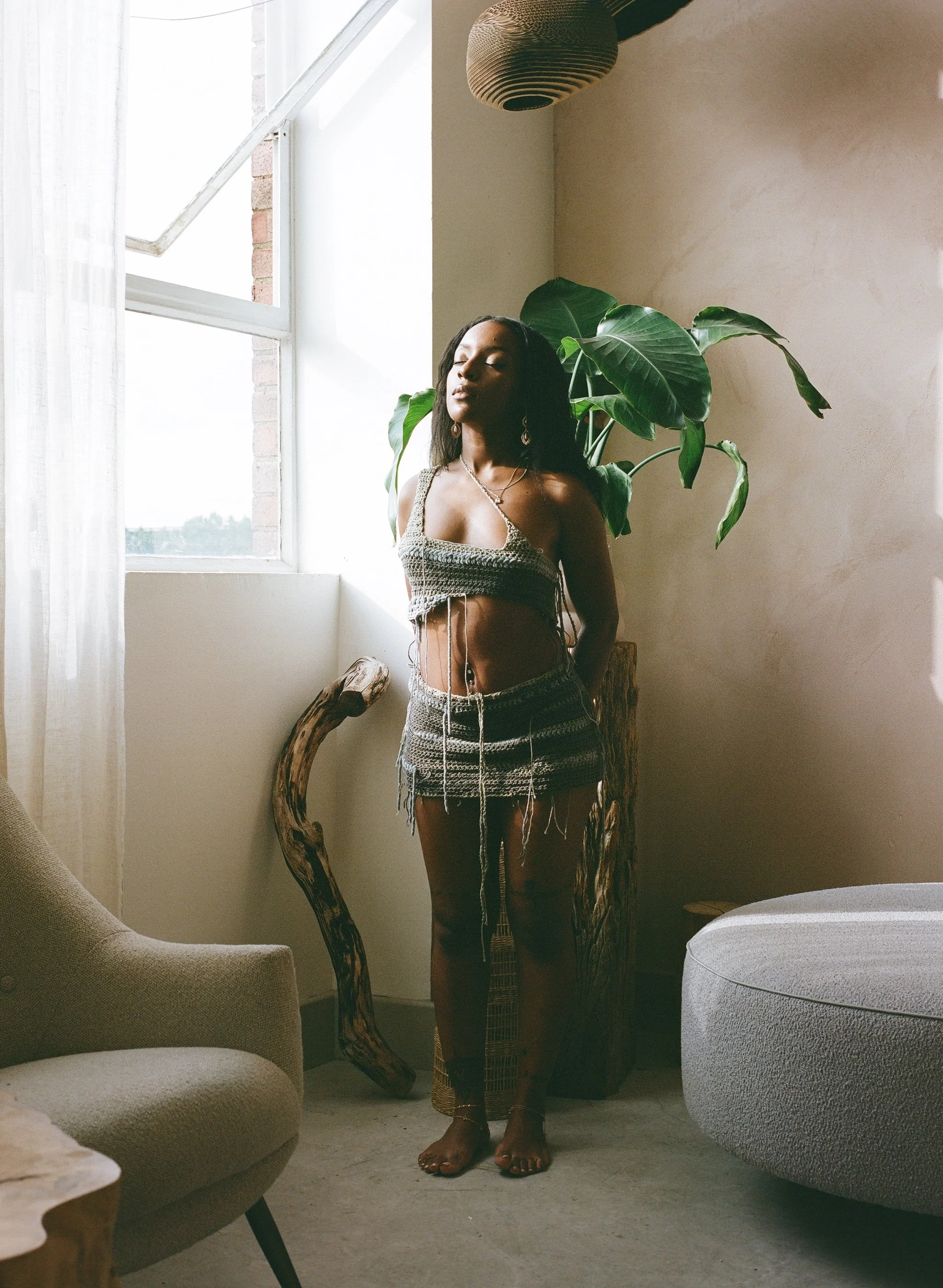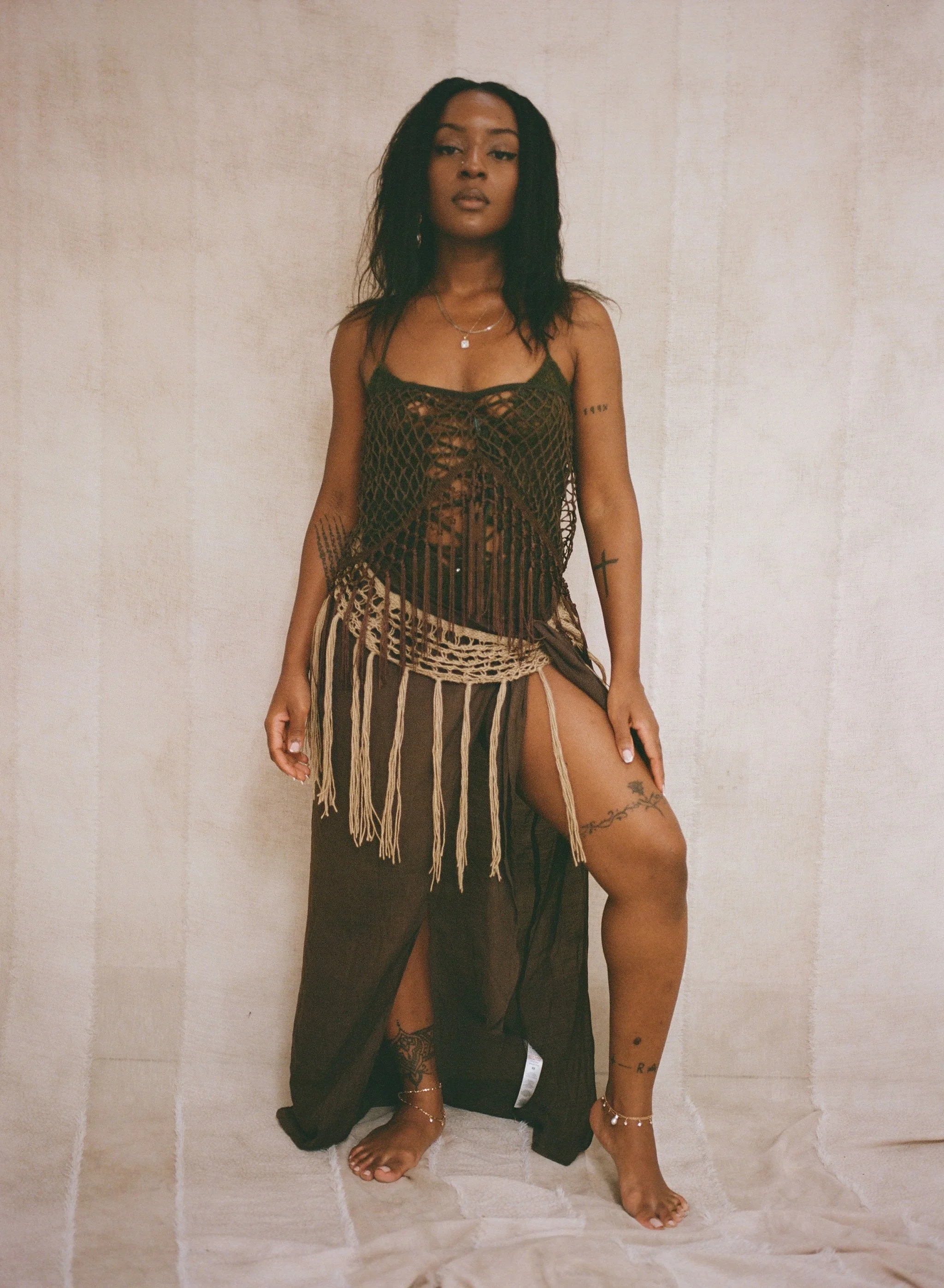 Photographer: Ishmael Zach/ @ishmaelzach_ + @thefontainetheory; Shot on 120mm film, Creative Directors: Aydrienne Nadine/ @xydrienne and Ishmael Zach/ @ishmaelzach_, Styling: Aydrienne Nadine/ @xydrienne, Handmade two-piece set by Aydrienne Nadine/ @xydrienne, Model: Aydrienne Nadine/ @xydrienne